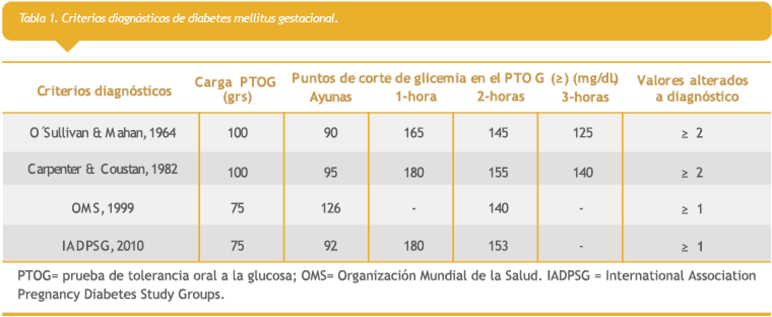 En 1964, O´Sullivan & Mahan propusieron el primer criterio diagnóstico para diabetes gestacional. Este criterio fue el único validado hasta la fecha por los autores, contra el desarrollo de diabetes materna ocho años después del parto, y posteriormente otros estudios mostraron evidencia que este criterio predice también complicaciones obstétricas en el embarazo (Tabla 1).