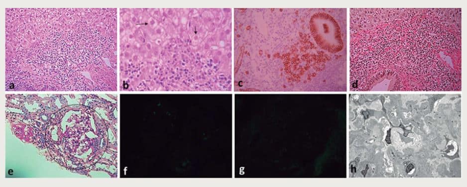 Figura 1. Lesiones histológicas. Fila superior (hígado) mostrando (a) infiltrado inflamatorio mononuclear con actividad de interfase (disrupción de la placa limitante); (b) balonización de los hepatocitos (flechas); (c) identificación de plasmocitos de localización periportal (reactividad de membrana celulares en inmunohistoquímica CD 138) y (d) escasa fibrosis (fibras colágenas en rojo) en la tinción de Van Gieson. Fila inferior (riñón): e) microscopía óptica en tinción de ácido peryódico de Schiff (PAS) mostrando la lesión de esclerosis glomerular focal (glomérulo destacado en círculo); (f) y (g) inmunofluorescencia glomerular negativa para C1q e IgG, respectivamente. En (h) microscopía electrónica con plegamiento de la membrana basal glomerular, ausencia de depósitos inmunes y desaparición completa de los pedicelos.