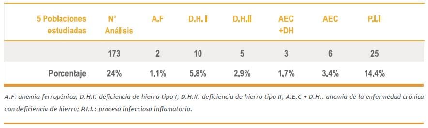 A la población incluida en el estudio se le realizo pruebas especiales de laboratorio. Se detectó que de los 173 niños aparentemente sanos, el 9% cursaban con deficiencias subclínicas en los estadios I y II de deficiencia de hierro (15 casos), el 1% en anemia ferropénica (2 casos), el 2% con anemia de la enfermedad crónica acompañada de anemia ferropénica (3 casos), 3% con anemia de la enfermedad crónica (6 casos), y el 14% con proceso infeccioso inflamatorio sin anemia; es decir el 24% de la población estudiada presentó alteración relevante.