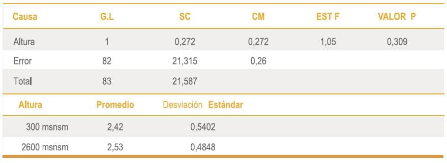 Se utilizaron análisis de tipo descriptivo. Análisis de varianza de un solo factor, donde el factor es la altura sobre el nivel del mar que presenta dos niveles: 300 msnm y 2600 msnm. También se utilizó la prueba no paramétrica de Kruskal – Wallis. El software de apoyo para el análisis de los resultados es SPSS 15.0. Un P valor menor de 0.05 en las pruebas se consideró significativo.