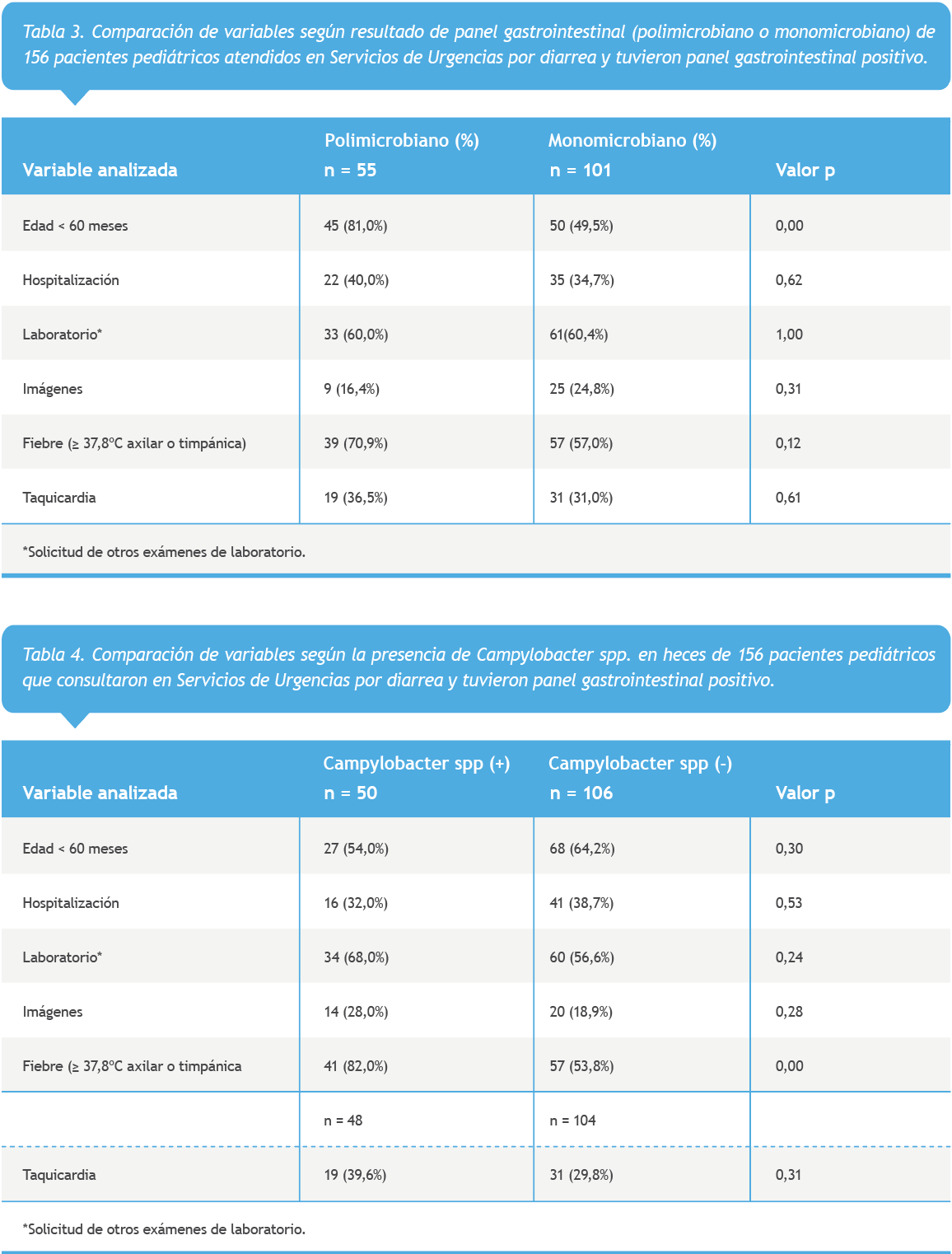 Las Tablas 2 y 3 comparan variables epidemiológicas ( edad), clínicas (fiebre y taquicardia en signos vitales) y del manejo (hospitalización y solicitud de otros exámenes de laboratorio o imágenes) de los pacientes, según el resultado positivo o negativo y monomicrobiano o polimicrobiano del panel GI, respectivamente. Destaca el mayor porcentaje de solicitud de solicitudes de laboratorio (60,3 vs 38,1%) y fiebre (62,8 vs 36,6%) en el grupo con panel GI positivo y el mayor porcentaje de pacientes menores de 60 meses de edad con resultado de panel GI polimicrobiano (81,0 vs 49,5%).