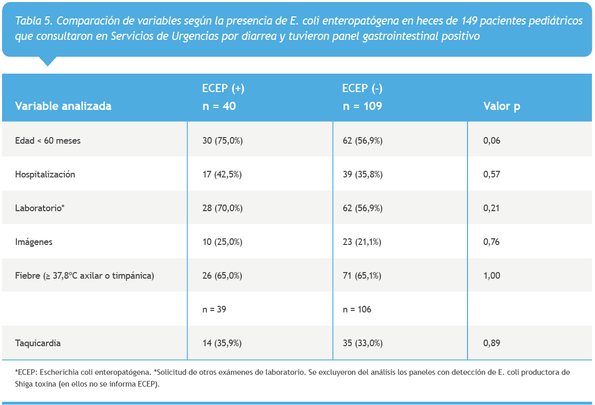 Por otro lado, las Tablas 4 y 5 comparan estas variables según detección de los agentes más frecuentemente identificados, Campylobacter spp. y ECEP. Destaca la mayor frecuencia de fiebre (82,0 vs 53,8%) en aquellos pacientes en los que se detectó Campylobacter spp. (p = 0,00).