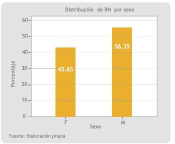 La distribución de género fue de 56,3% para el sexo masculino y 43,6% para el femenino. La media de edad fue de 2,16 días (Figura 1 y Tabla 1).