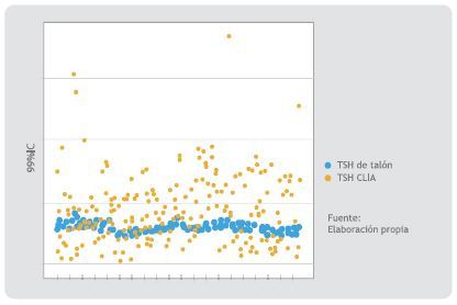 Figura 2. Rangos comparativos de dispersión entre TSH medida en sangre de talón (fluorometría) y sangre venosa (quimioluminiscencia)