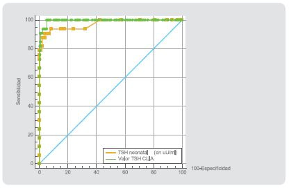 Ambas técnicas mostraron sensibilidad y especificidad altas, con un área bajo la curva de ambas, cercana a 0,972 (ROC), (IC 0,941 – 0,989), al 95%; demostrando ser eficientes en la pesquisa diagnóstica de HC; por lo que planteamosel uso alternativo de equipos de quimioluminiscencia (CLIA) para determinación sérica directa de TSH neonatal, en los servicios que no cuentan con laboratorio especializado.