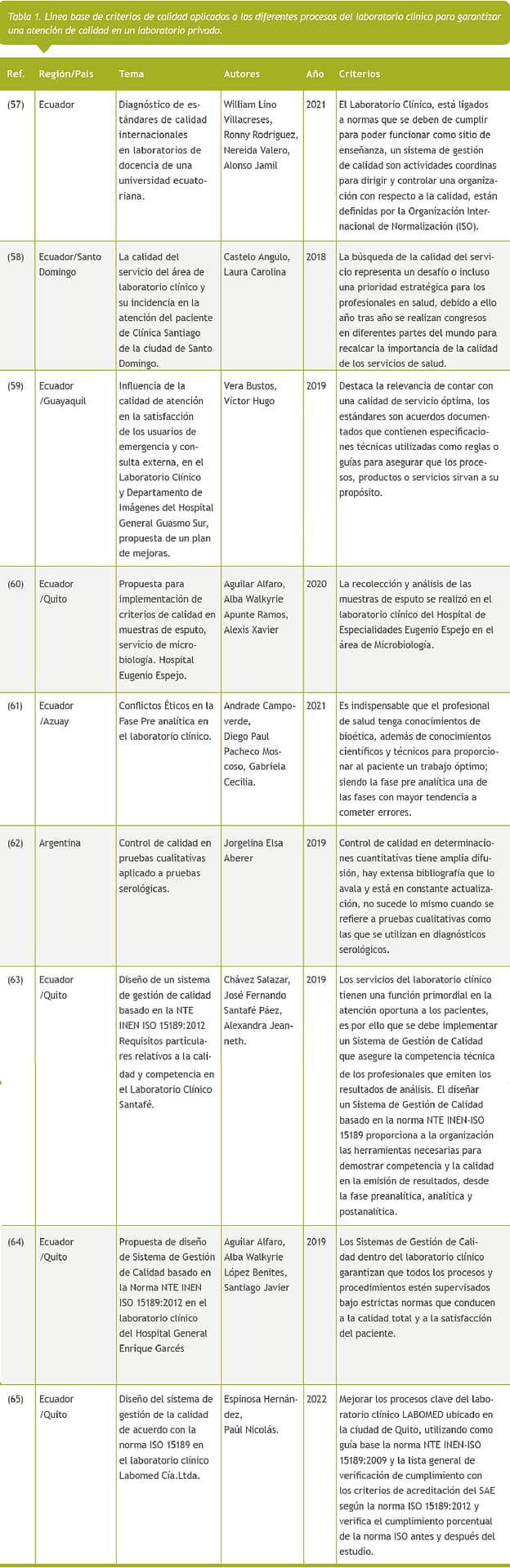 La investigación se basa en la búsqueda literaria más relevante sobre el tema a tratar. Luego de una lectura de títulos de abstracts, se estableció que artículo se incluía y cual no. Se aplicó un cuestionario valiéndose en el cumplimiento de La información de los artículos se la registró en una línea base de criterios de calidad aplicados a los diferentes procesos del Laboratorio clínico para garantizar una atención de calidad en un laboratorio privado, donde contiene información sobre año de publicación, país, autores, tema y criterios. Luego, se realizó la síntesis de los artículos revisados, de los cuales se extrajo la información que estaba incluida en la revisión.