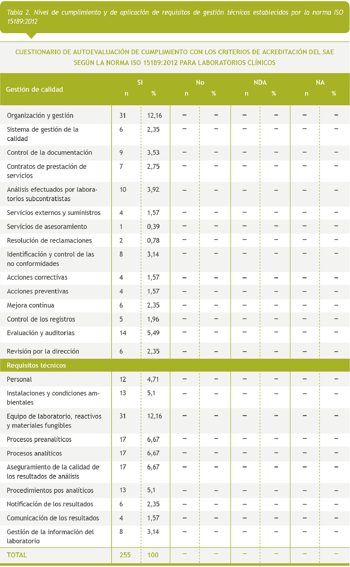 Tabla 2. Nivel de cumplimiento y de aplicación de requisitos de gestión técnicos establecidos por la norma ISO 15189:2012