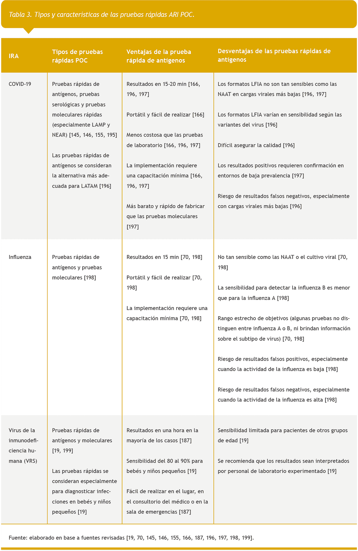 La Tabla 3 resume los tipos de pruebas elegibles para diagnóstico rápido en POC según las infecciones respiratorias agudas (IRA). La tabla también ofrece una visión general de las ventajas y desventajas asociadas al uso de pruebas rápidas de antígenos, consideradas una de las opciones más adecuadas para POC en América Latina (LATAM). Es importante destacar que, aunque algunas de estas desventajas están relacionadas con características intrínsecas de estas pruebas, existen medidas para mejorar su desempeño, que se describieron en la Sección 4.1.