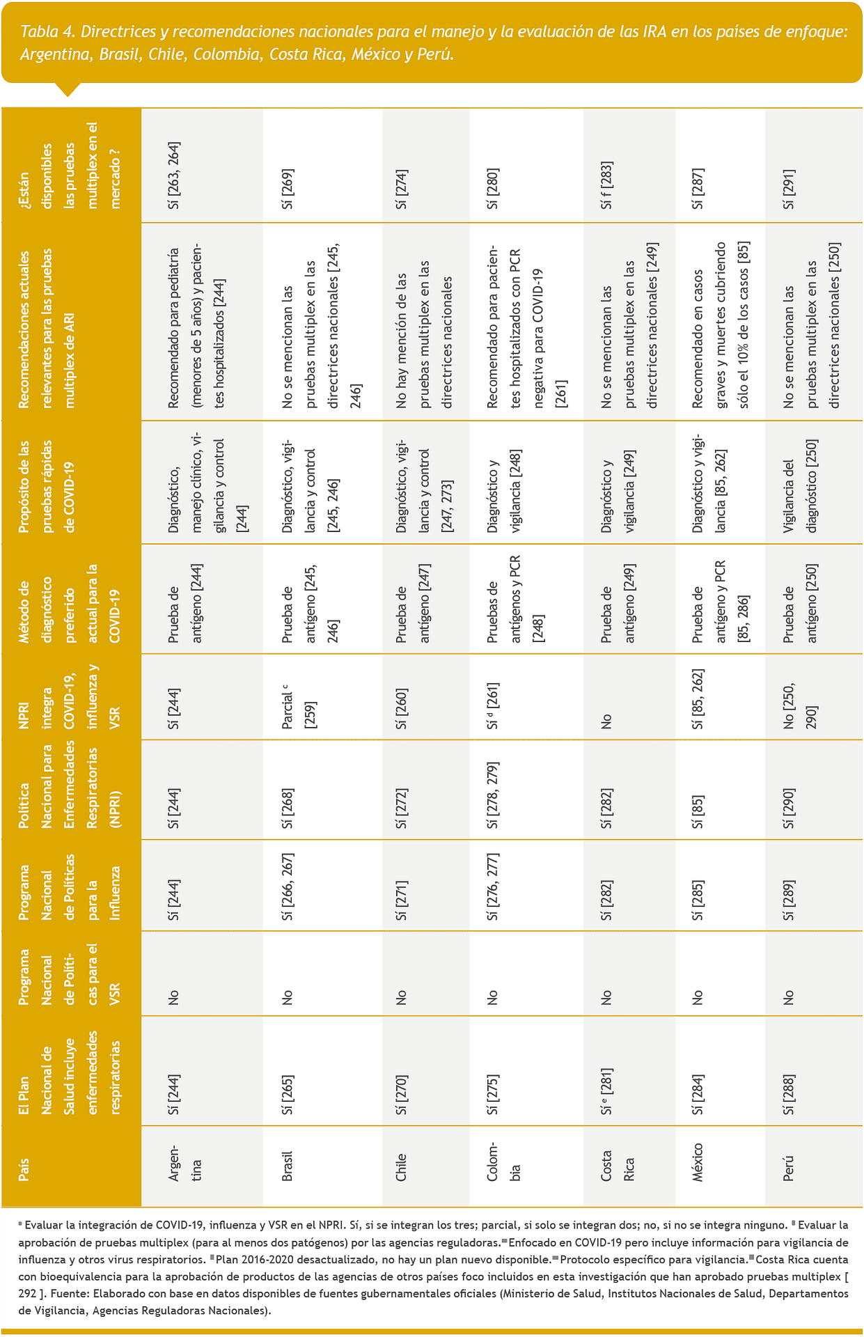 La Tabla 4 resume el panorama actual de las políticas relevantes para el manejo de las infecciones respiratorias agudas (IRA) en los países analizados. Cabe destacar que todos los países actualmente incluyen las enfermedades respiratorias en sus Planes Nacionales de Salud y cuentan con políticas nacionales específicas tanto para enfermedades respiratorias como para la influenza. Por el contrario, ninguno de los países posee una política nacional para el VSR. Dado el llamado de las organizaciones internacionales [238] a integrar la COVID-19 en los servicios existentes, se observó que para julio de 2023, la mayoría de los países de interés ya habían incorporado la COVID-19 a la Política Nacional de Enfermedades Respiratorias (al menos mediante protocolos de vigilancia), siendo Costa Rica y Perú los que mostraban mayor rezago [85,103,244,257,259–262]. Si bien es evidente el avance en materia de políticas para las infecciones respiratorias, persisten desafíos importantes en su implementación, en particular en lo que respecta a la asignación de recursos suficientes.