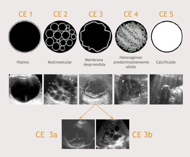 Figura 1. Características de las imágenes ecográficas y clasificación de la OMS de las etapas evolutivas. Fuente: WHO Informal Group on Echinococcosis1.