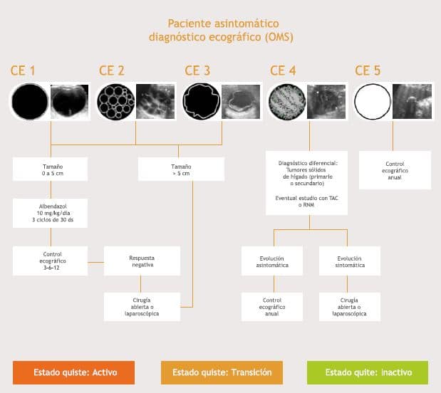 En el año 2003 el grupo de trabajo de la OMS sobre la equinococosis (WHO-IWGE) publicó una clasificación ecotomográfica que monitorea su historia natural. Esta se traduce en el paso de un quiste simple a una etapa de transición, la cual finaliza con su inactivación.