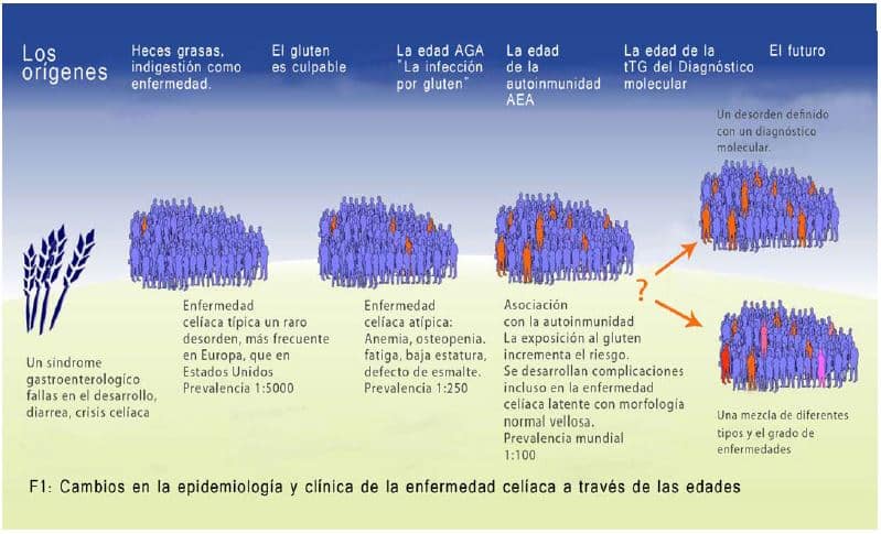 La Edad AEA marcó un cambio importante en el conocimiento de la EC, un trastorno intestinal raro debido al gluten y se expresa con síntomas gastrointestinales (sólo la punta del iceberg), a un trastorno autoinmune común provocado por el gluten en el intestino. Es de destacar que la parte sumergida del iceberg es mucho más grande en comparación con la punta y, de la misma manera, los síntomas clínicos distintos del gastrointestinal son mucho más comunes que los síntomas típicos, donde la enfermedad en sí es mucho más común que lo que se consideraba anteriormente. En efecto, la EC podría ser sospechada en pacientes con una variedad de trastornos autoinmunes tales como la diabetes, la tiroiditis, la dermatitis herpetiforme, ataxia autoinmune, alopecía, así como los síntomas debidos directamente a la mala absorción.