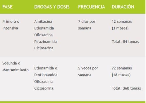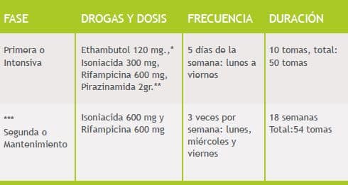 En el caso del tratamiento ambulatorio el paciente se dirige al centro de salud más cercano y es administrada una primera fase de medicamentos combinados como isoniacida, rifampicina, pirazinamida, y ethambutol de lunes a viernes con una duración de 10 semanas y un total de 50 tomas. Una vez cumplido el total de tomas el cual es supervisado por el personal de enfermería y registrado en una boleta de control, se pasa a una fase de mantenimiento la cual consiste en la administración de isoniacida y rifampicina 3 veces a la semana (lunes, miércoles y viernes), 18 semanas con un total de 54 tomas. En el caso de los pacientes hospitalizados la administración del tratamiento es de lunes a domingo en la fase intensiva; y los lunes, miércoles y viernes en la fase de mantenimiento (5)