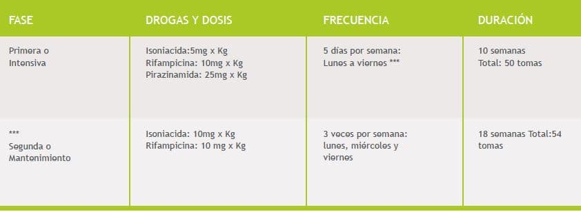 El tratamiento a pacientes tuberculosos debe ser administrado en un periodo de 6 meses, y este tiempo debe cumplirse para poder descartar enfermedad tuberculosa, es por ello que la administración debe ser estrictamente supervisado, estrategia que se denominó en un inicio como TAES por sus siglas en inglés.