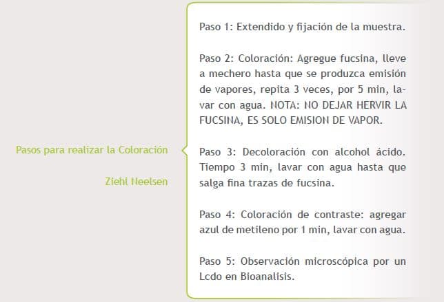 Coloración empleada para la visualización del bacilo de koch. El bacilo presenta una pared celular de ácidos micólicos que le confiere la propiedad de resistir a la decoloración con alcohol ácido, motivo por el cual el bacilo se tiñe de color fucsia. El procedimiento para la realización de la coloración se basa en una serie de pasos, los cuales deben realizarse cumpliendo todas las normas de bioseguridad requeridas para ello por el personal de laboratorio.