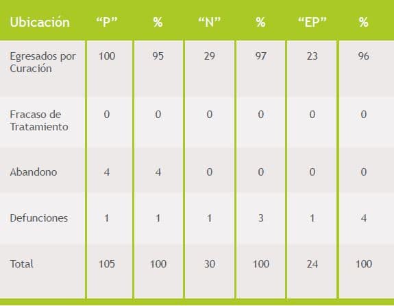 En el cuadro I se muestra el número de pacientes diagnosticados como tuberculosos clasificándolos en 3 series: serie pulmonar (P), serie extra pulmonar (EP) y sin demostración bacteriológica (N), así como las condiciones para el egreso de casos por cohorte en el año 2015. Se obtuvo que la mayoría de los pacientes fueron clasificados dentro de la serie pulmonar ya que de los 159 pacientes diagnosticados como tuberculosos, 105 pacientes (66%) fueron serie P, así mismo se puede apreciar que de esos 105 pacientes serie P, 100 pacientes se curaron al recibir el tratamiento siguiendo la norma DOTS, lo que representa el 95.23%, 4 pacientes (3.8%) abandonaron el tratamiento y 1 paciente falleció (0.95%) así mismo se aprecia que 30 pacientes(18.86%) serie N: 29 pacientes se curaron al recibir tratamiento, lo cual representa el 96.66% y 1 paciente falleció (3.33%), de 24 pacientes serie EP(15.09%): 23 pacientes, que representa el 95.83% al recibir el tratamiento estrictamente supervisado por el personal se curaron, y 1 paciente falleció.