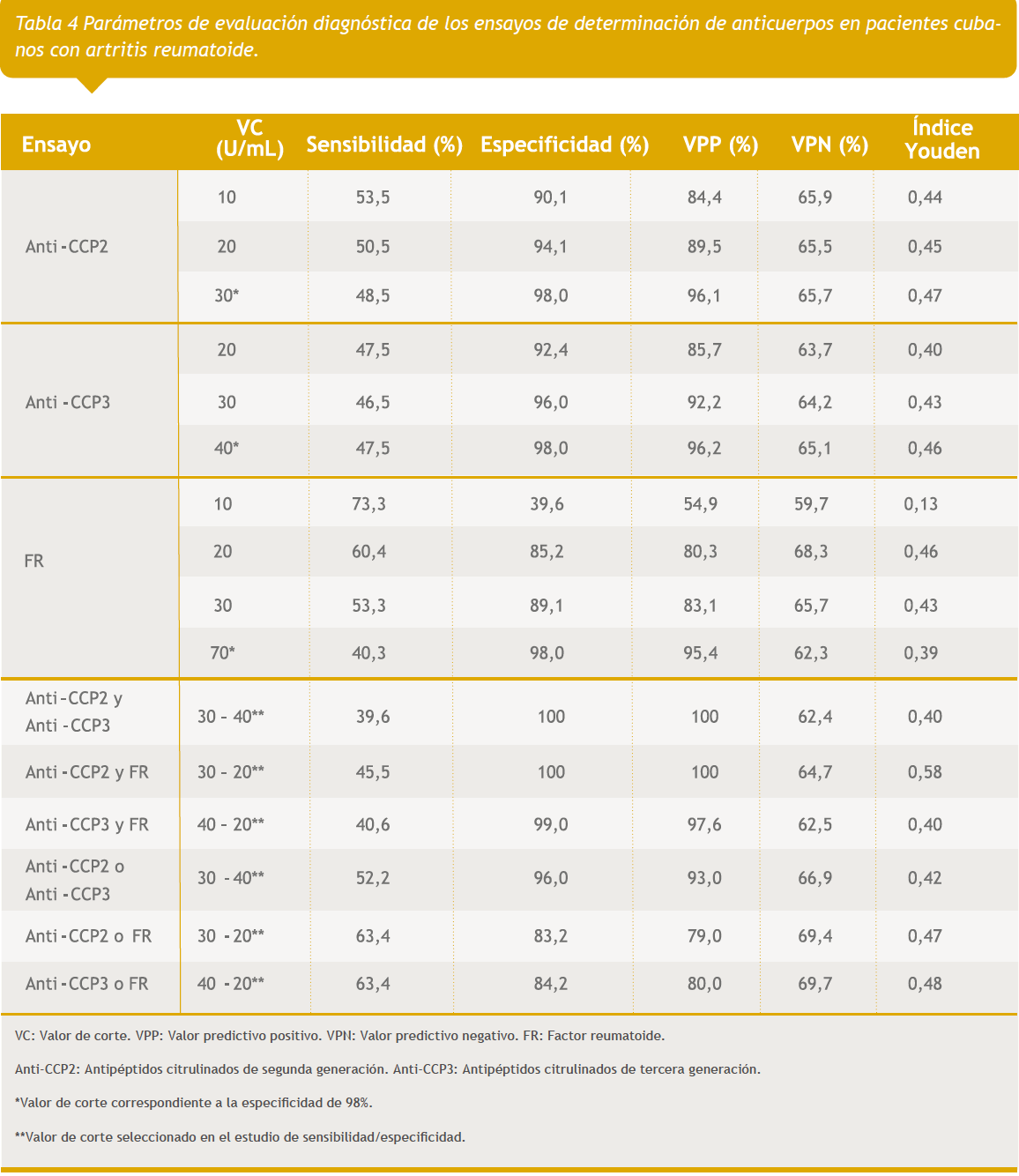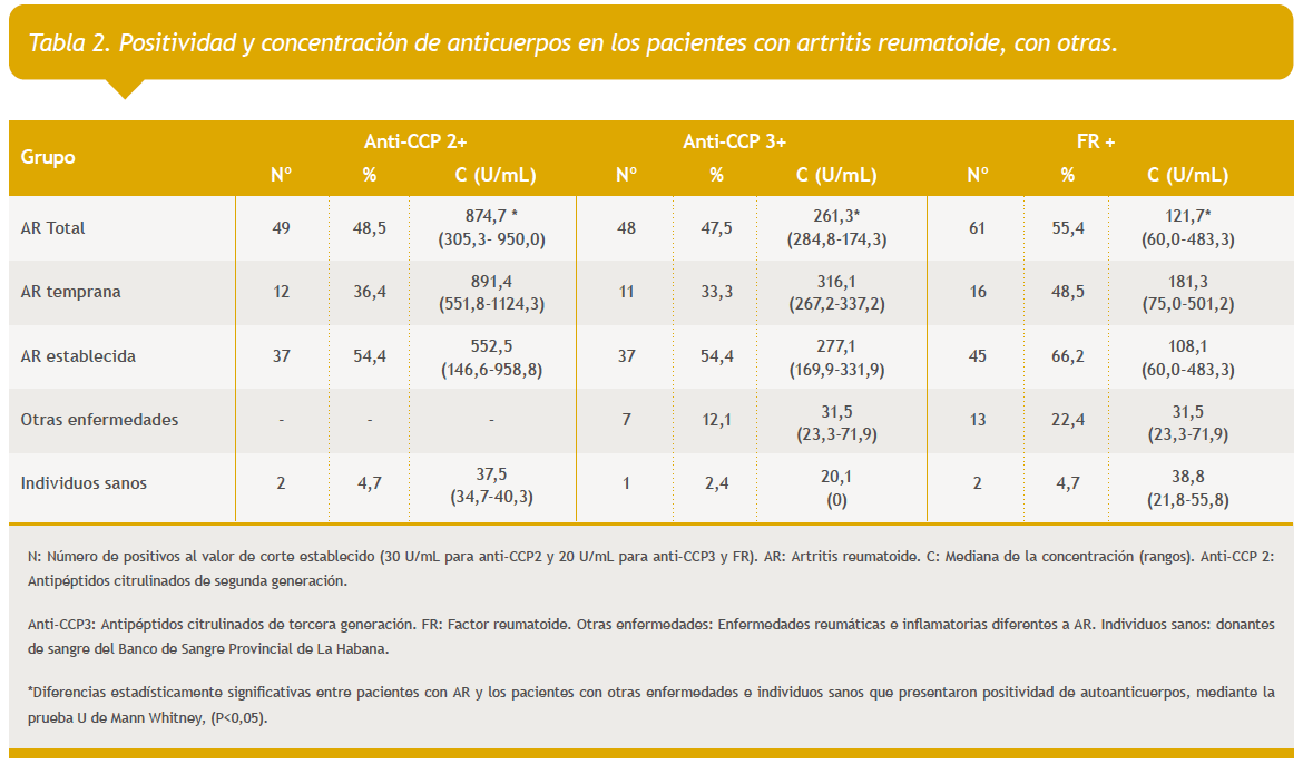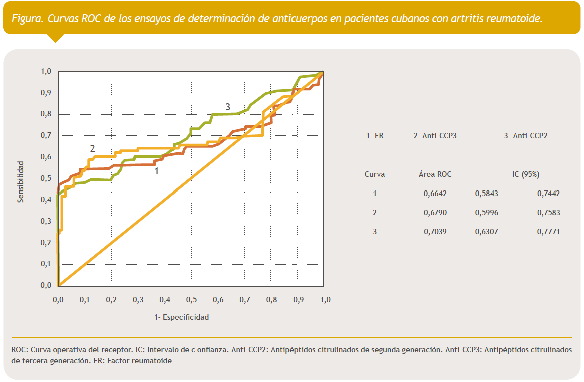 Conclusions: Anti-CCP2 antibodies are the ones of greater effectiveness in the diagnosis of Cuban patients with rheumatoid arthritis. RF identification allows to identify seronegative anti- CCP2 patients; therefore, the combination of both immunoassays leads to an improvement in the diagnostic effectiveness.