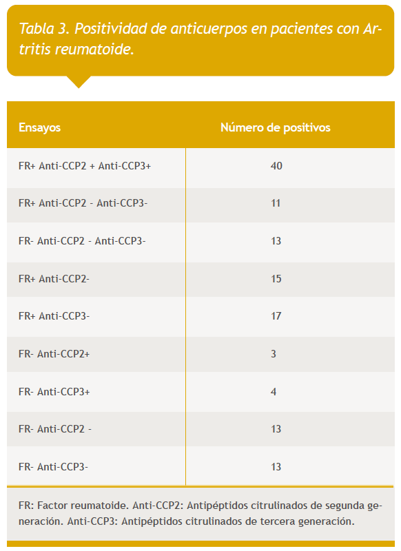 En los pacientes negativos de FR se observaron anticuerpos anti-CCP2 en 3 de ellos y anti-CCP3 en 4 pacientes (Tabla 3).