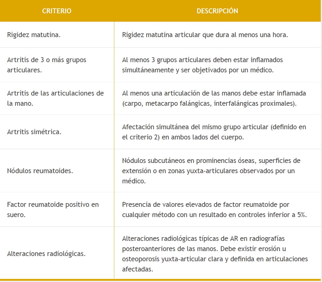 Los pacientes que cumplen ≥4 criterios son clasificados como AR. Los criterios 1-4 han de estar presentes al menos durante 6 semanas. Los 14 grupos articulares a tener en cuenta en el criterio núm 2 son: interfalángicas proximales, metacarpo falángicas, muñecas, codos, rodillas, tobillos y metatarso falángicas.
