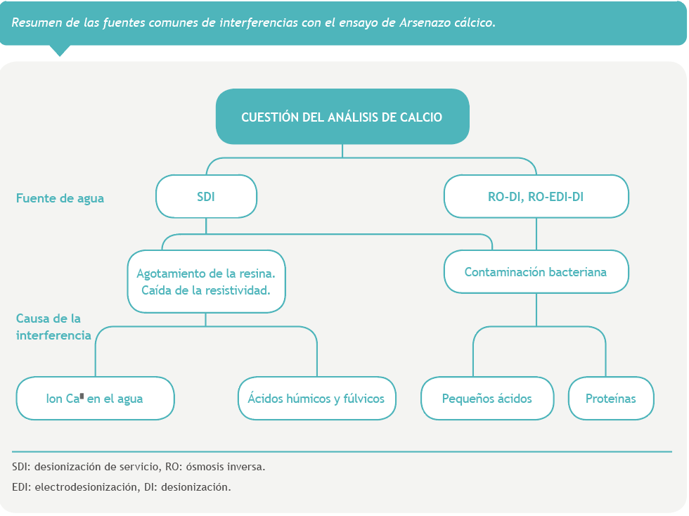 Este documento analiza el impacto del agua en el análisis de Arsenazo cálcico y el hecho de que la pureza del agua puede influir en la precisión de los resultados del ensayo. Las bacterias aparecen como la fuente más común de problemas para el ensayo de calcio, debido a la liberación de proteínas y pequeños ácidos orgánicos que pueden unirse al calcio. Otras dos fuentes de interferencias, a saber, los efectos de las fugas de calcio y los grandes ácidos orgánicos en la concentración de calcio, pueden deberse a la calidad del agua cuando se utilizan resinas de intercambio iónico solas (desionización de servicio – SDI) para purificar el agua. Se analizan brevemente las soluciones para reducir el recuento de bacterias en los analizadores clínicos y los sistemas de purificación de agua que utilizan tecnologías combinadas.
