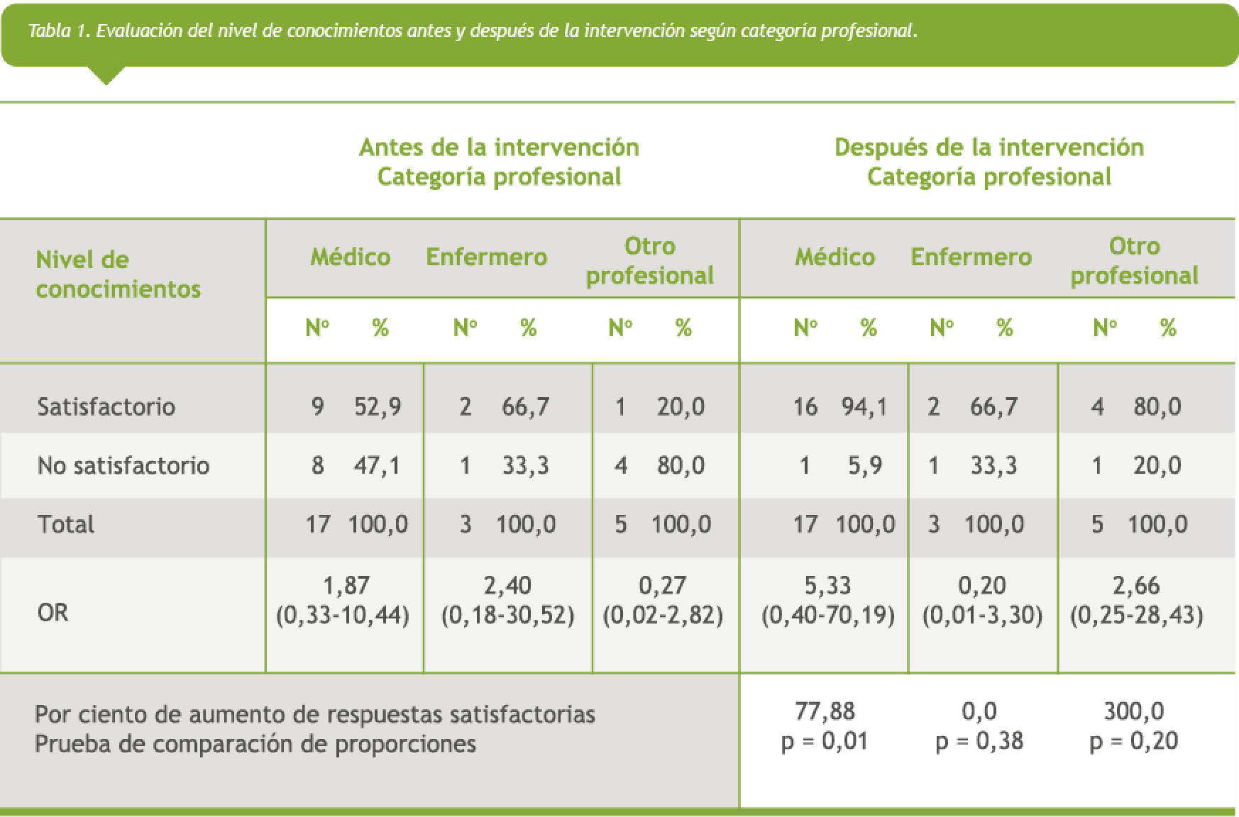 Con vistas a determinar la asociación entre cada una de las variables generales de los profesionales; antes y después de la intervención (categoría profesional, categoría docente, año de graduación) en relación al nivel de conocimientos; se calculó la oportunidad relativa (OR) con su intervalo de confianza de 95 % considerando significativo valores superiores a 1.