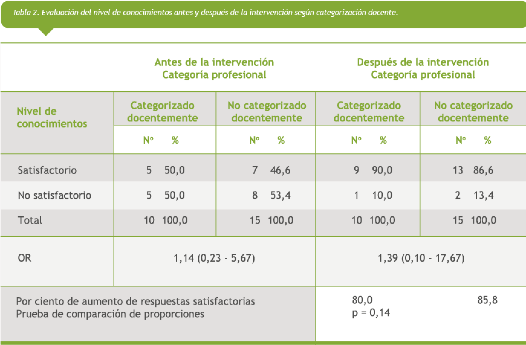 En la tabla 2 se refleja la evaluación general del nivel de conocimientos de los profesionales según la categorización docente, tanto antes como después de la intervención. Como se observa, en un primer momento las mayores dificultades se presentaron en profesionales no categorizados donde el 53,4 % obtuvo una evaluación no satisfactoria. Posterior a la intervención las principales dificultades se presentaron igualmente en los profesionales no categorizados docentemente, donde el 13,4 % de los mismos obtuvieron calificaciones no satisfactorias. Tanto antes como después de la intervención, la probabilidad de obtener resultados satisfactorios estuvo asociada con la categorización docente; sin embargo, esta asociación no fue significativa.