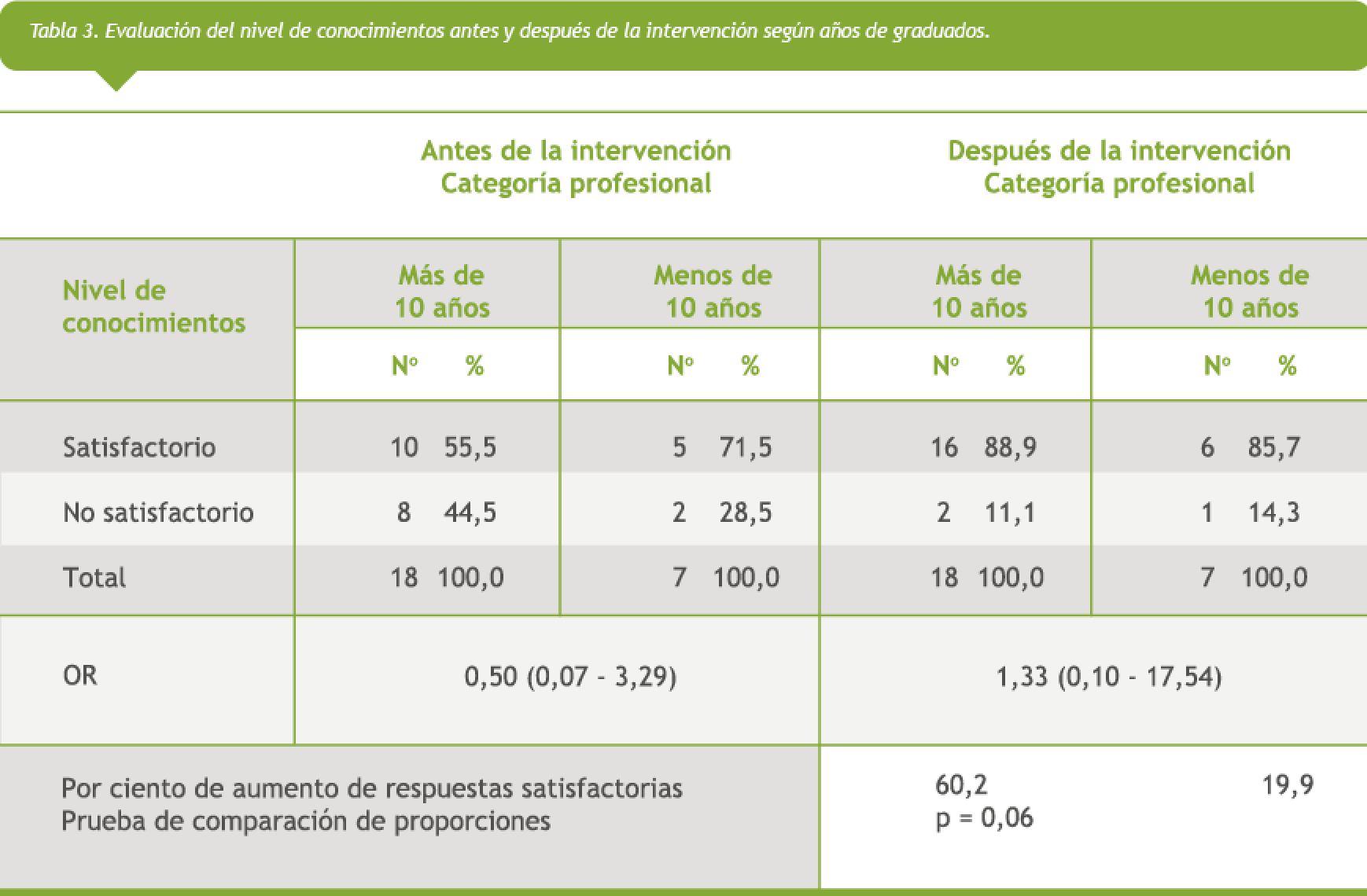 En la tabla 3 se refleja la evaluación general del nivel de conocimientos de los profesionales según años de graduado. Como se observa, en un primer momento las mayores dificultades se presentaron en los profesionales que superaban los 10 años de graduado, donde el 44,5 % obtuvo calificación no satisfactoria. Posterior a la intervención, el por ciento de profesionales con calificaciones satisfactorias fue similar para ambos grupos. No se observó asociación entre el tiempo de graduado y el nivel de conocimientos. Se constató un 60,2 % de aumento de respuestas satisfactorias después del curso en los profesionales que tenían más de diez años de graduados versus 19,9 % en los que tenían menos de diez años. Al aplicarse la prueba de comparación no se encontró asociación al obtenerse valores de p superiores a 0,05.