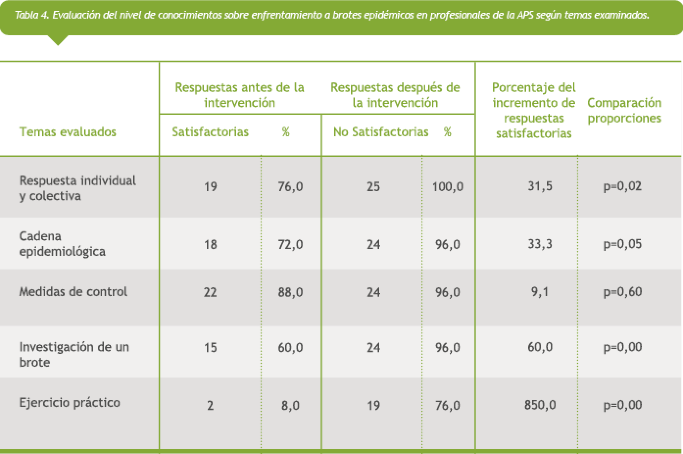 En la tabla 4 se muestra que los profesionales evaluados presentaron mayores dificultades antes de la intervención en los temas relacionados con los pasos para la investigación de un brote y el ejercicio práctico respecto a este tema. Solo un 60 % y un 8 % obtuvieron evaluaciones satisfactorias en estos temas. En la interrogante referente a las medidas de control antiepidémico el 88 % de los profesionales obtuvieron evaluaciones satisfactorias. Después de la intervención todas las evaluaciones fueron superiores a los 70 puntos. Se obtuvo un incremento de respuestas satisfactorias por encima de un 30 % en todas las interrogantes excepto en las medidas de control antiepidémico debido a que, en la evaluación inicial, un elevado por ciento de profesionales obtuvieron evaluaciones satisfactorias en este tema, siendo significativo en todas las interrogantes al aplicar la prueba Mc Nemar de comparación de proporciones excepto en igual tema.