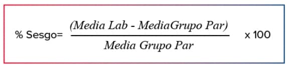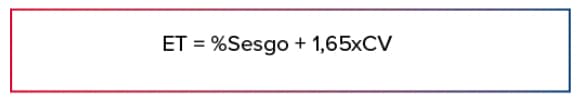 El Error Total (ET) de un proceso de medida contempla el Error Aleatorio (EA) y el Error Sistemático (ES) del procedimiento. El EA representa la imprecisión, por lo tanto, se cuantifica con el Coeficiente de Variación (CV), el cual es obtenido en el CCI. Es un error no predecible y varía de medición en medición. Las fuentes de estos errores suelen ser difíciles de detectar: fluctuaciones en la corriente eléctrica, ruido o temperatura, burbujas u obstrucciones en dispensar muestras o reactivos, entre otras. Respecto al ES está representado por la exactitud, lo que implica que se cuantifica con el Sesgo, el cual se obtiene por la comparación con otros laboratorios (ver fórmula) o se puede obtener siguiendo las guías de CLSI (EP15 y EP9). Por lo general, se puede predecir o cuantificar y se debe tratar de eliminar. Algunas posibles causas de este tipo de error pueden ser: cambio de lote o deterioro de reactivos o calibradores, alteraciones en el instrumento, como lámpara o pipetas, etc.
