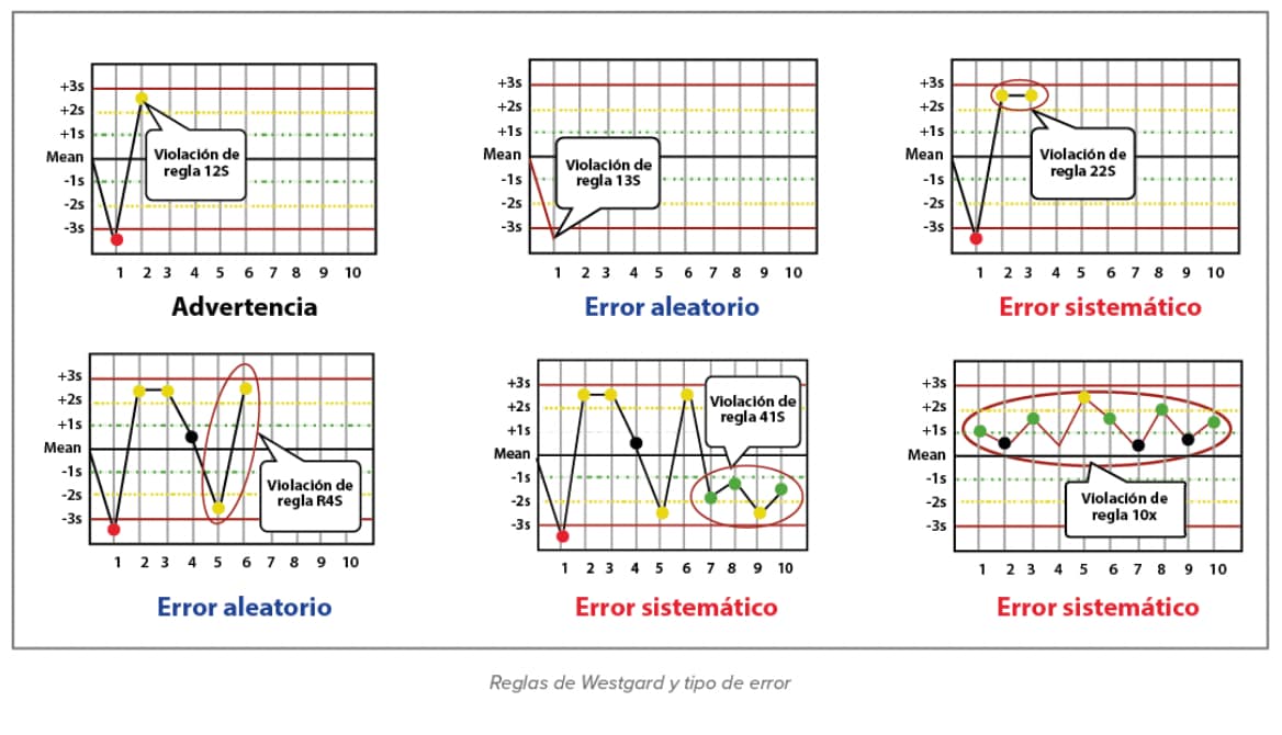 Con estos conceptos, se puede considerar que la media, que es un indicador de la tendencia central, está relacionada con la exactitud o ES. Por otro lado, el SD y CV se relacionan con la dispersión o distribución de los resultados, por lo tanto, con la imprecisión o EA. Para poder detectar estos tipos de errores se utilizan las reglas de Westgard. Las reglas que identifican ES son 2.2s, 2 de 3.2s, 4.1s, 8x o 10x; mientras que las reglas para EA son 1.2/2,5s y R4s. Es de gran utilidad realizar el seguimiento diario de las gráficas de Levey-Jennings, para la detección del incumplimiento de alguna de las reglas y, por lo tanto, identificar rápidamente el tipo de error y posiblemente de donde proviene. Ver ejemplo en gráfica 1.