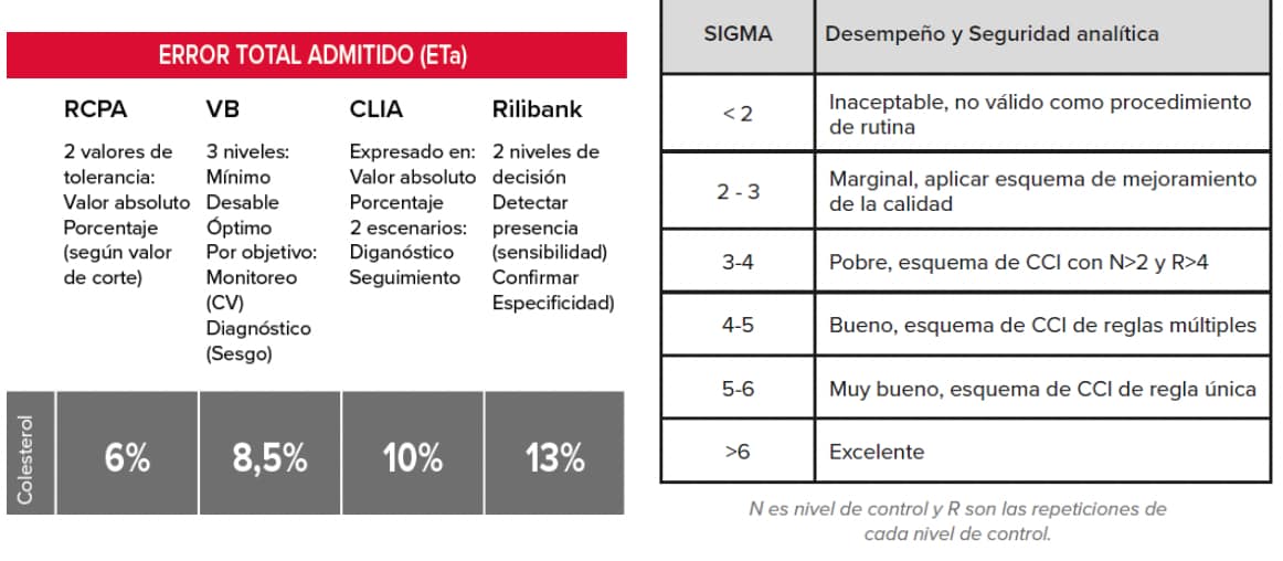 Cuando el ET calculado es menor al ETa (ETETa), es necesario utilizar otra metodología o se requiere una estrategia de control de calidad más exigente. Dentro de las distintas fuentes de ETa, se pueden observar diferentes criterios de límites. Como ejemplo, se pueden observar los distintos ETa, según cada referente, para el Colesterol Total: