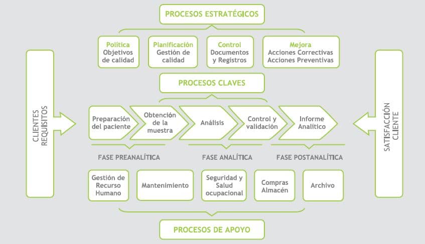 Gráfico 1 (primer imagen a la derecha). Mapa de procesos en un laboratorio clínico. Fase preanalítica, fase analítica y fase postanalítica.
