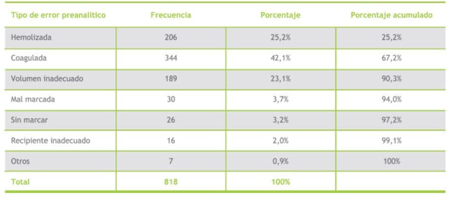 En este estudio se encontraron como principales causas de rechazo, al igual que en la literatura, las muestras coaguladas y hemolizadas, altamente asociadas a mala técnica de toma de muestra. Por ende, es muy importante que en cada sala exista y se socialice el instructivo en el que se describa de una manera detallada el procedimiento para la toma adecuada de las muestras. El diagrama de Pareto muestra que se debe priorizar y dirigir los esfuerzos en solucionar las causas que conllevan a muestras coaguladas y hemolizadas. Reducir estos errores, que son los más significativos, servirá para una mejora general de los demás; el potencial de mejora contenido en ese pequeño porcentaje de causas es mucho mayor que el contenido en las restantes.