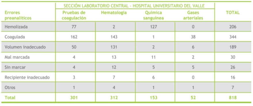 En el laboratorio central se considera que una muestra se encuentra en condiciones inadecuadas cuando se presenta alguna de las siguientes situaciones: muestra coagulada, hemolizada, con volumen inadecuado, recipiente inadecuado y mal o no marcada; otros errores: recipiente que se quiebra en la centrífuga o cuando llega la orden médica sin la muestra. Esta información se obtuvo del sistema interno Hexalis,en el cual se ingresan los datos de todas las muestras que llegan al laboratorio en el formato de recolección de la información (7) se registró adicionalmente la sección del laboratorio en la que se realizaba el rechazo (bioquímica o hematología), las salas del hospital que habían realizado el envío y el día y la hora en el cual llegaban las muestras al laboratorio.