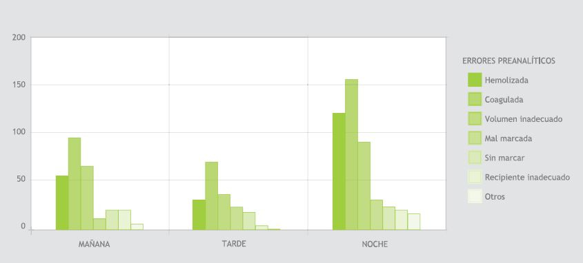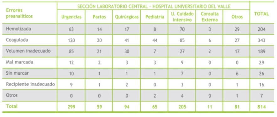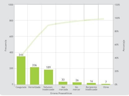 Resultados: Se identificaron 818 errores preanalíticos (frecuencia relativa del 4%). La distribución de errores fue: muestra coagulada, 42%; muestra hemolizada, 25%; volumen de muestra inadecuado, 23%; muestra mal marcada, 4%; muestra sin marcar, 3%; muestra en recipiente inadecuado, 2%; otras causas, 1% (tubo se quebró en la centrífuga, no llegó la muestra). El mayor número de errores se derivaron de los servicios de urgencias, unidad de cuidados intensivos adultos y quirúrgicos; estas no conformidades se concentraron principalmente en los días del fin de semana y en el turno de la noche.