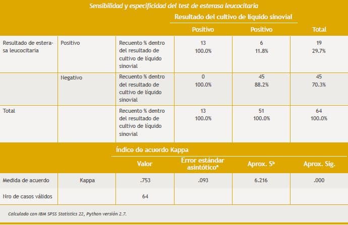 Considerando dos cruces como positiva ante proceso infeccioso articular, la esterasa leucocitaria mostró una sensibilidad de 100%, especificidad de 88.24%, con un valor predictivo positivo de 68.42% y valor predictivo negativo de 100%, con un índice de concordancia Kappa de .753 (Tabla 1).