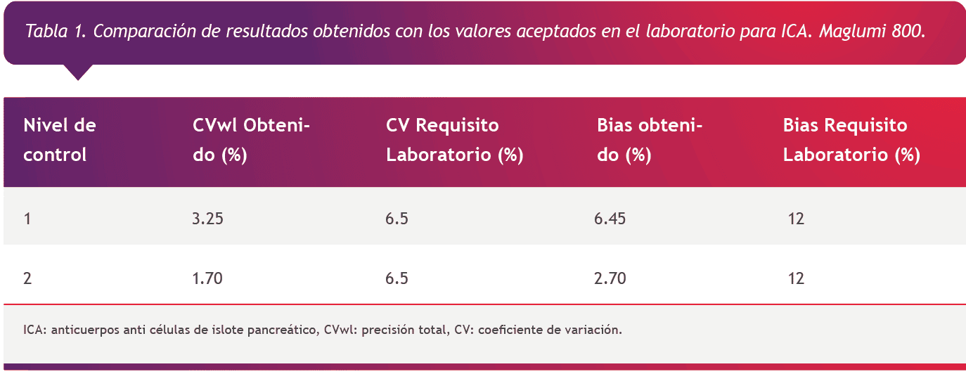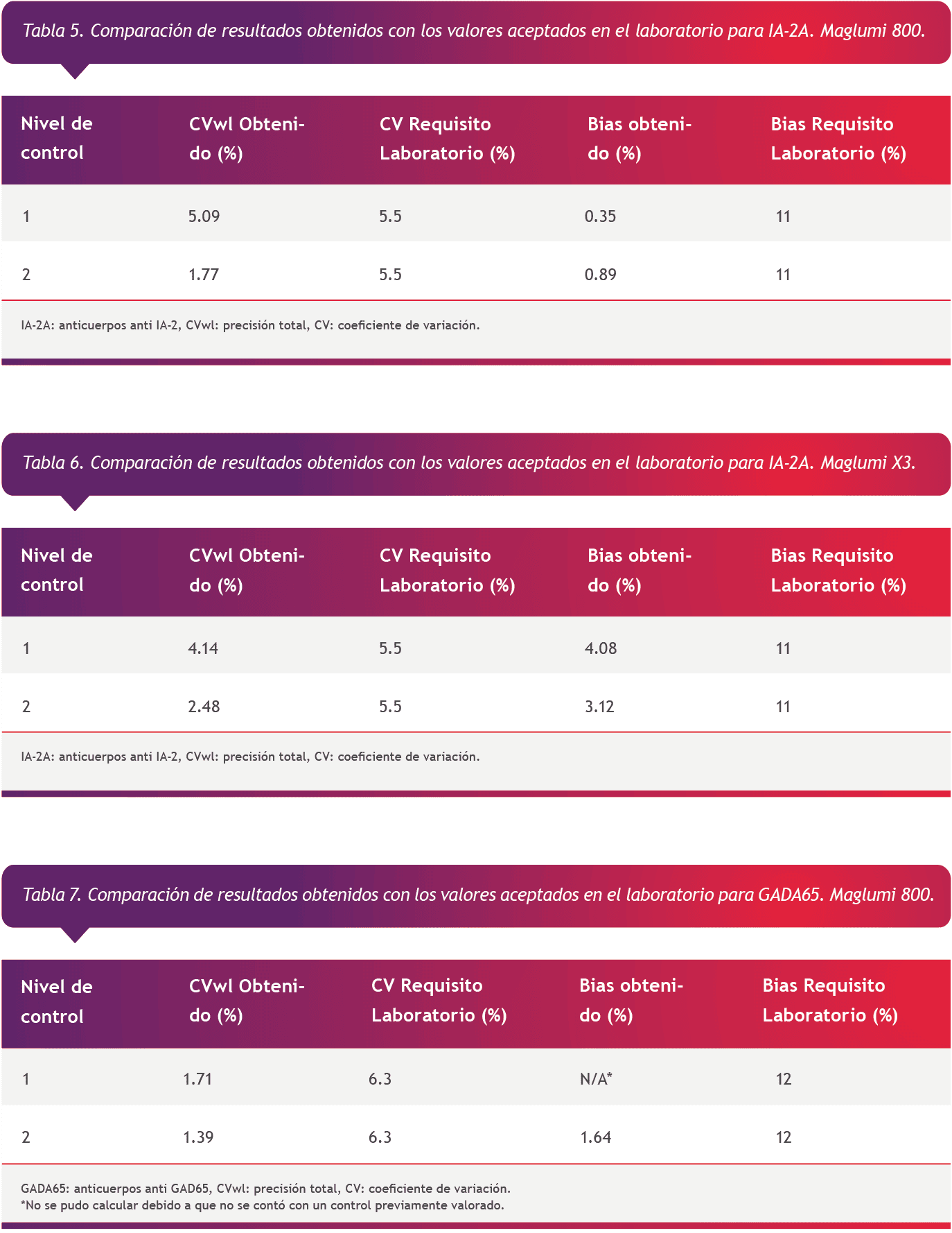 Los resultados obtenidos en la evaluación del desempeño analítico de los tests ICA, IAA, GADA65 e IA-2A realizados en los equipos Maglumi 800 y Maglumi X3 cumplen con los requisitos establecidos por el laboratorio.