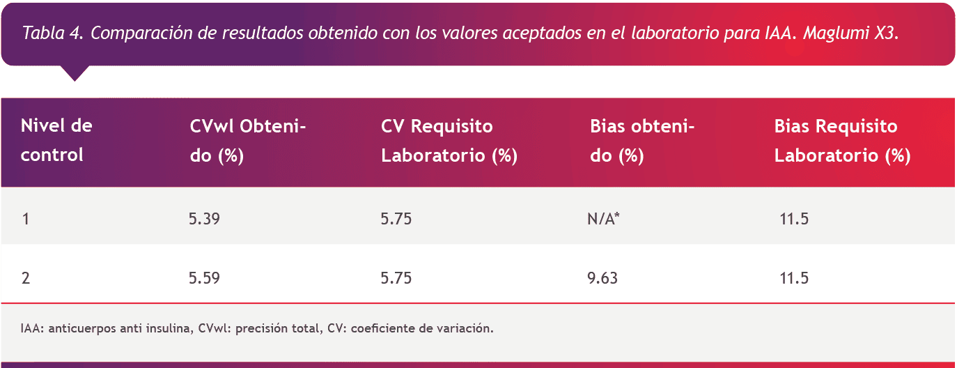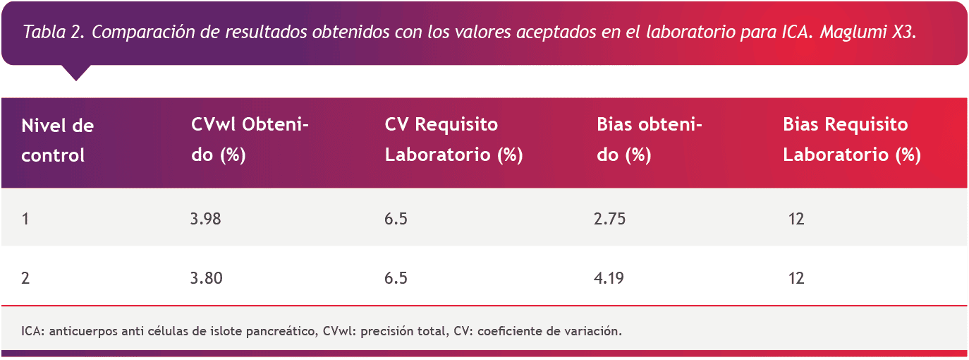 Teniendo en cuenta los resultados mostrados en las Tablas 1 y 2, se puede observar que el desempeño analítico en términos de precisión total (CVwl) y Bias obtenidos para el biomarcador ICA es mucho menor que el requisito fijado previamente por el laboratorio.