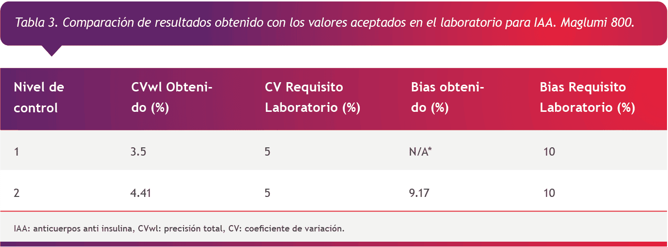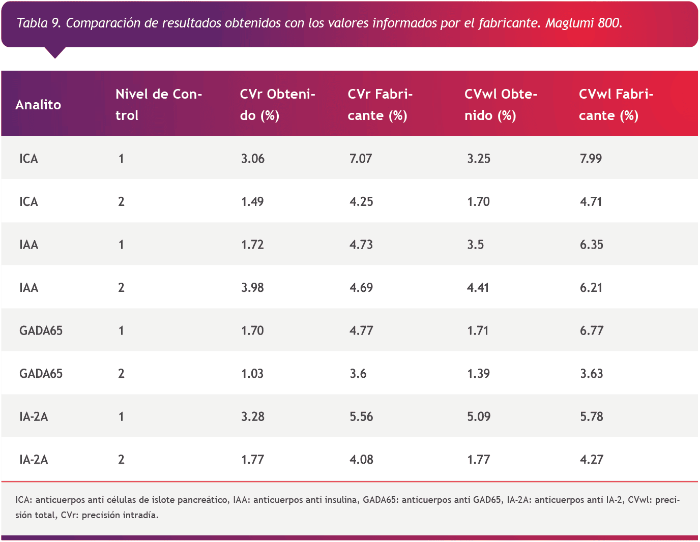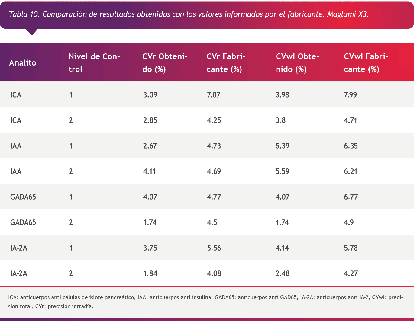 Según los resultados obtenidos en nuestro laboratorio (Tabla 9), la precisión intradía (CVr) y la precisión total total en Maglumi 800 para ICA y GADA65, es mucho mejor que la obtenida por el fabricante. En lo concerniente a IAA, puede concluirse lo mismo para el nivel 1, aunque en el nivel 2 se observó un desempeño similar al informado por el fabricante, especialmente en precisión intradía. El biomarcador IA-2A mostró un desempeño en términos de precisión intradía y precisión total para el nivel 2 significativamente superior al reportado por el fabricante. No obstante, los valores obtenidos para el nivel 1 fueron comparables a los especificados por el fabricante.