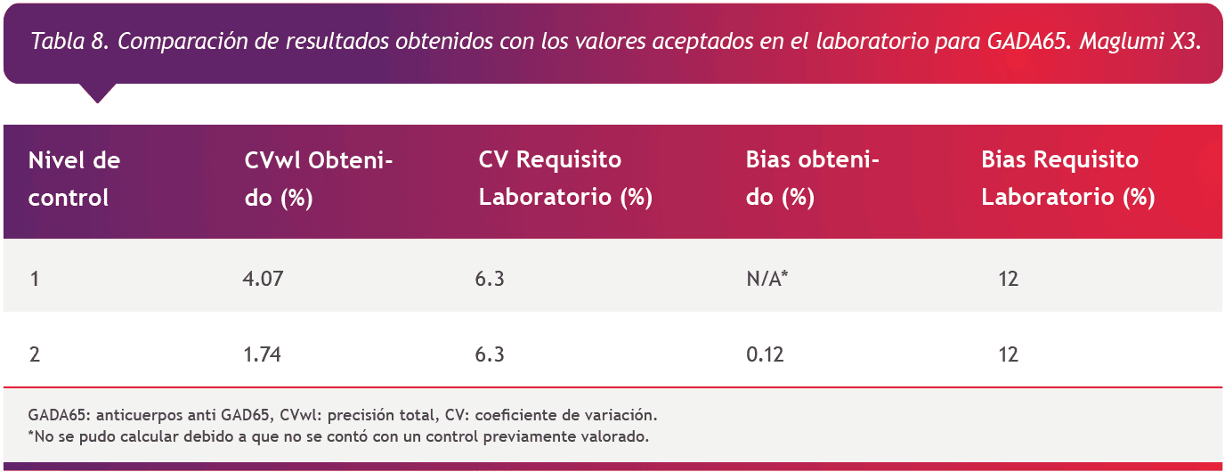 El caso de GADA65 fue similar para ambos Maglumi (Tabla 7 y 8). El CVwl y el Bias fueron mucho menores que los requisitos de laboratorio. No pudo calcularse el Bias para nivel 1 debido a falta de material previamente valorado para realizar el ensayo.