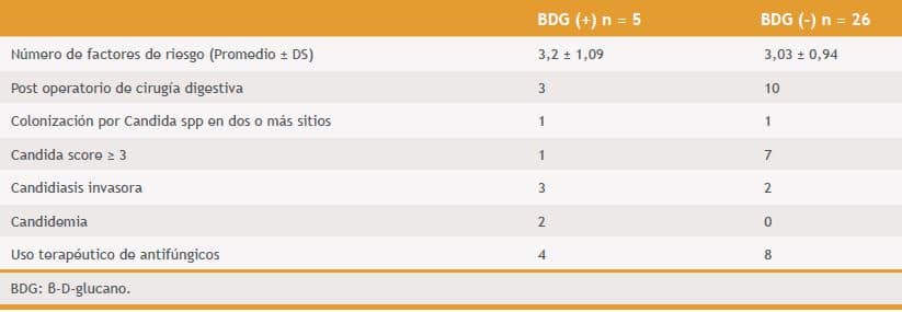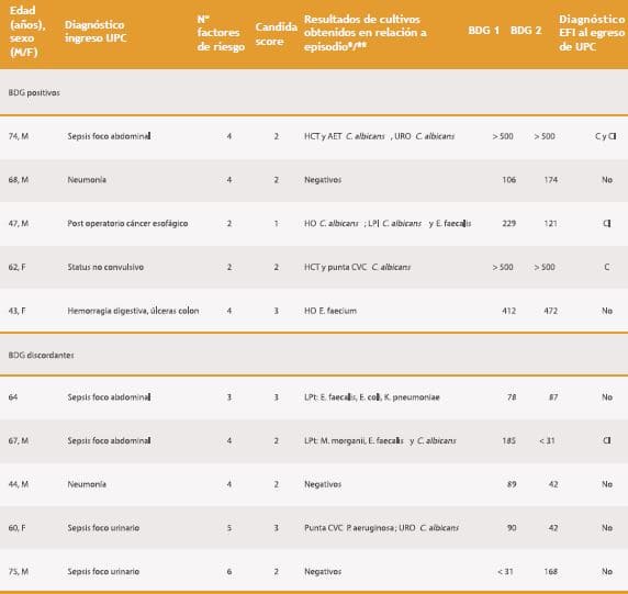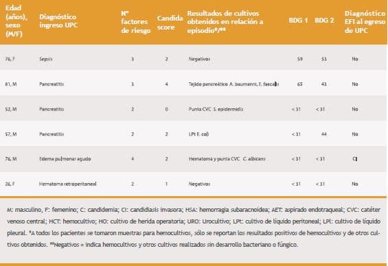 En el grupo de pacientes con BDG positivo, destaca que en aquellos casos en que se documentó candidemia el valor fue consistentemente > 500 pg/mL; en otro caso los hemocultivos fueron negativos, pero tuvo aislamiento de Candida de dos sitios, evolucionó favorablemente con uso de antifúngicos egresando de UPC con diagnóstico de EFI. Por el contrario, hubo dos casos sin identificación de Candida spp. en cultivos; uno de ellos, por el diagnóstico de úlceras colónicas recibió antifúngicos sin poder confirmarse C/CI; en cambio, el otro paciente evolucionó favorablemente sólo con terapia antibacteriana por lo que la impresión clínica fue que no presentó EFI.