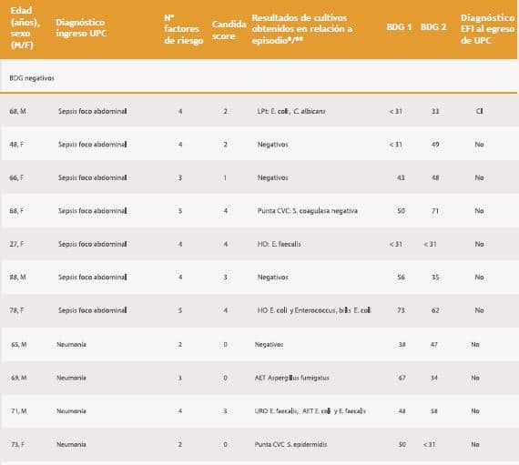 En la Tabla 1 se presentan los datos de los casos, agrupados por resultado de BDG, incluyendo edad, sexo, diagnóstico al ingreso, factores de riesgo, Candida-score, resultado de cultivos y diagnóstico de EFI al egreso de UPC, si correspondían a C/CI o no.