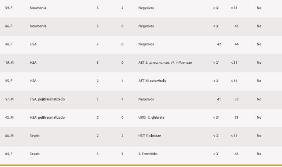 El promedio de edad fue de 59 años (rango: 19 a 88 años); 20 (56%) correspondieron a individuos de sexo masculino y 32 (88%) se incluyeron por fiebre prolongada, sin respuesta al uso de antimicrobianos de amplio espectro. Treinta y un pacientes (86%) tenía alguna comorbilidad, siendo la más frecuente hipertensión arterial (60%), seguido por enfermedad pulmonar obstructiva crónica (17%), diabetes mellitus y/o dislipidemia (11%). Los diagnósticos de ingreso a UPC fueron sepsis (n: 15; 41,7%), neumonía (n: 8; 22,2%), hemorragia subaracnoidea (n: 5; 13,9%), pancreatitis (n: 3; 8,3%), hemorragia digestiva baja (n: 1; 2,8%), status no convulsivo (n: 1; 2,8%), post-operatorio de cáncer esofágico (n: 1; 2,8%) hematoma retroperitoneal (n: 1; 2,8%) y edema pulmonar agudo (n: 1; 2,8%). El promedio de estadía en UPC previo a la inclusión fue de 9 días (rango: 7 a 39 días).