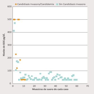 Existen pocos datos sobre el rendimiento de la medición del BDG en pacientes críticos. Estudios observacionales han mostrado que pacientes con EFI, en su mayoría por Candida spp., presentan valores elevados de BDG en mayor proporción que pacientes sin infección14,15 sugiriendo que su incorporación en protocolos asistenciales permitiría diagnosticar de manera más precoz pacientes con candidemia y/o candidiasis invasora (C/CI).
