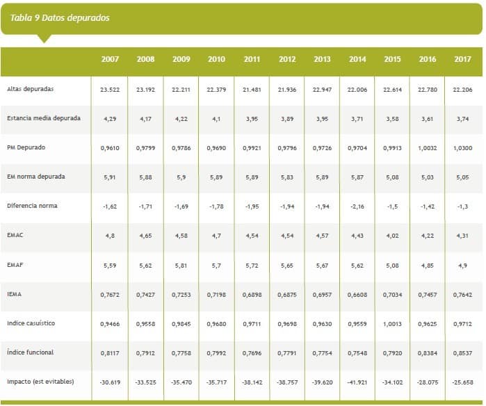 Los datos depurados del período, Tabla 9, muestra Índices Casuístico y Funcional estables con EM depurada en disminución.