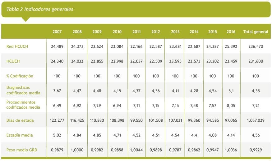En los resultados globales y generales mostrados es posible deducir que se puede tener una visión del establecimiento en cuanto a sus características, y así ver que nuestra población de pacientes es semejante en número y complejidad clínica en el decenio mostrado y que ha habido modificación en indicadores que muestran mejor gestión clínica, reflejado como OS en descenso, menos días cama y estancia media y también de un indicador muy general como es la mortalidad intrahospitalaria que también disminuye.