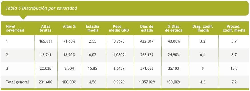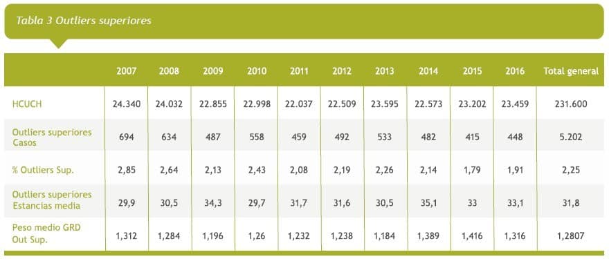 Results The global complexity index was 0.9929. The average of diagnoses coded was 4.35 and of procedures was 7.21. The average stay was 4.56 days, with a downward trend. The top outliers corresponded to 2.25%, with stable hospital days and average DRG weight. The median of hospital mortality was 1.65% with a tendency to decrease and stable DRG mean weight. Seventy two percent had a grade 1 severity, with low median hospital stay. They occupied 40% of bed days. Nine percent had a grade 3 severity with high median hospital stay and accounting for 31.5% of bed days.