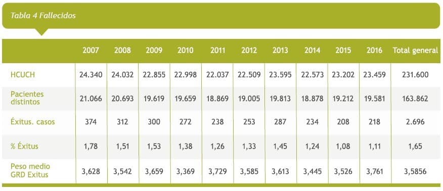 En Tabla 4 podemos ver que ocurre con los pacientes que su estado al alta es fallecido, hay pacientes que han tenido más de una hospitalización ya sea por la misma patología de base o por otra en el mismo año, son alrededor de 3.000 cada año, en ellos la mortalidad intrahospitalaria se aprecia un descenso progresivo desde 1,78% a 1,11%, siendo un universo semejante en número y PM.