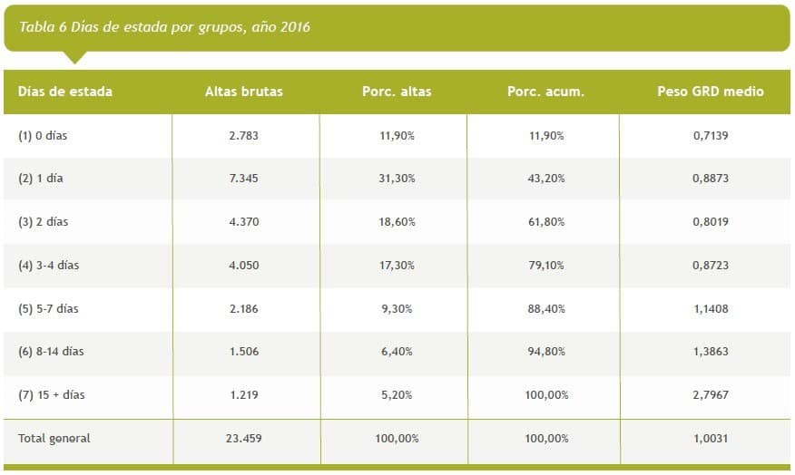 Evaluado la totalidad de los egresos del año 2016 en cuanto a sus días de estada, en Tabla 6, 79,1% de ellos tiene una estancia media de 4 o menos días con un PM cercano a 0,8, luego desde los 5 o más días de estada la frecuencia disminuye pero aumenta el PM a 2,7967 con 15 o más.