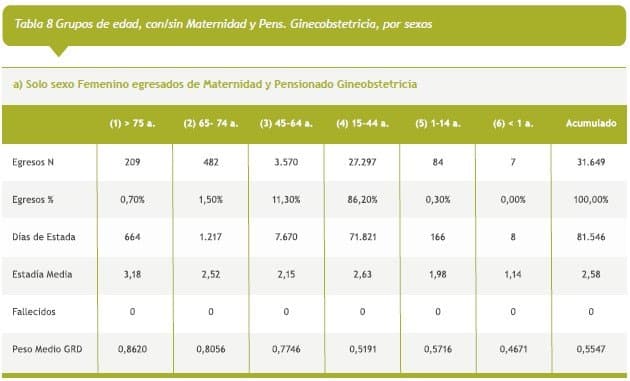 Los egresos de Maternidad y Pensionado Ginecobstetricia, sólo femeninos, Tabla 8a, 86,2% son de edad fértil con PM cercano a 0,5, sin fallecidos. Si se excluye los egresos de Maternidad y Pensionado Ginecobstetricia y se separan por sexo, Tabla 8b los grupos de edad son semejantes en los parámetros mostrados.